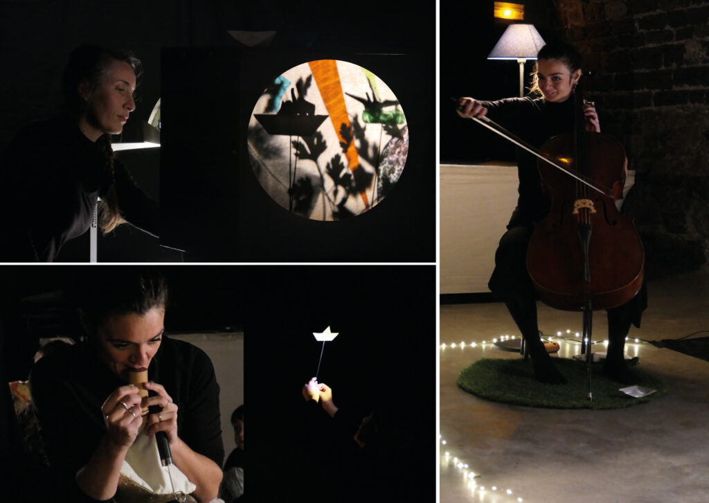 Tout commence par la rencontre entre un violoncelle, un ciné-lune, deux rêveuses, un tapis herbu et une lune fugueuse. Au fil du spectacle, les ombres inaccessibles se transforment en objets avec lesquels les enfants, leurs accompagnants et les artistes vont pouvoir jouer et réinventer un langage commun. En partageant les éléments scéniques au public, nous leur proposons de les manipuler avec nous ; permettant ainsi de développer leur motricité fine, leur écoute, leur curiosité et de se mettre en lien les uns avec les autres. La frontière scène/salle, abstraite pour un public si jeune, s’effaçant ainsi au profit d’une aventure collective.